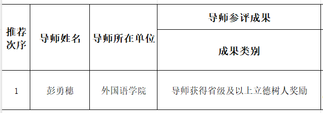 按照學校《關于評選2024年度優秀研究生導師的通知》要求,經個人申請,學院學位評議組審議,決定推薦彭勇穗老師為優秀研究生導師,現予以公示: