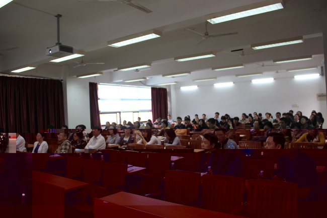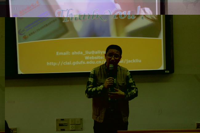 2014年4月3日下午,備受師生關注的“外語名家講壇”第八講在大學城校園實驗一号樓604如期舉辦。此次講座的主講嘉賓為全國大學英語教學指導委員會委員、廣東省大學英語教學指導委員會主任、廣東外語外貿大學副校長、博士生導師劉建達教授。我校章雲副校長、教務處領導班子成員和我院黨政領導出席了此次活動。來自廣東外語外貿大學、南方醫科大學、廣東技術師範學院和廣東白雲學院等兄弟院校的領導、教師代表以及我院全體教師參加了此次活動,活動由我院蔣澄生院長主持。
