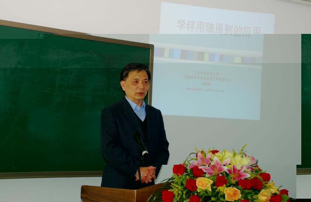 聘任儀式結束後,王教授做了題為“‘學伴用随’原則的應用”的報告。“學伴用随”是王教授提出的二語習得理論與方法之一。他在演講中闡述了幾個重要概念:1. 語境補缺---即母語語境知識補缺,強調了母語幹擾的背後有着母語語境知識的中介作用,是中式英語和啞巴英語的成因。2. 交互---有了交互,才能産生語境效應和明确的意義,從而驅動外語學習。交互、語境、意義三者與外語學習之間的邏輯聯系顯示外語學習根植于語言學習變量的交互中。3. 協同---即說話者因互動而産生的相互配合。協同不僅促進話語理解,也常常使得說話者重複自己和對方用過的詞語。之後,王教授從英語教學的三大情結——“糾錯、語法、考試”出發,談到了自己對外語學習和教學的一些意見和建議。其中,王教授針對“中國的英語老師喜歡在課堂上講解學生作業中的錯誤,讓我們明白為什麼犯錯,錯在哪裡,很有成就感”這一客觀現象發表了自己的看法。他認為,學習外語經常犯錯,在所難免,一個重要的原因是有母語的幹擾。這類錯誤我們往往意識不到,很難消彌,隻能通過學習和不斷強化正确的用法去抑制它,降低母語幹擾度,即“大量使用正确的語言去擠壓犯錯的空間”。
