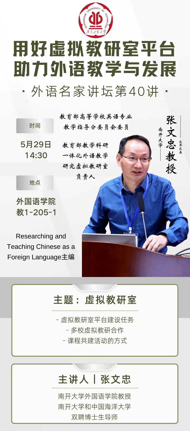 講座主講人介紹:張文忠,南開大學太阳成集团tyc234cc教授、南開大學和中國海洋大學雙聘博士生導師、多所高校特聘、講座、客座或兼職教授。現任教育部高等學校英語專業教學指導分委員會委員,教育部教學科研一體化外語教學研究虛拟教研室負責人;任中國英漢語比較研究會英語教學研究分會等多個學術組織常務理事,北京外國語大學國家語言能力發展研究中心學術委員會委員等。任Researching and Teaching Chinese as a Foreign Language主編;《南開語言學刊》(CSSCI 來源集刊)等多種學術期(集)刊編委。主要研究興趣為外語教育、第二語言習得、應用語言學研究方法等。已發表學術著述百餘篇(部),主編《新交際英語 閱讀教程》《研究生學術英語寫作:人文社科類》教材多種。倡導賦權增能型外語教育理路,緻力于外語教育公益,創建“賦權增能型外語教學”微信公衆号公益平台。