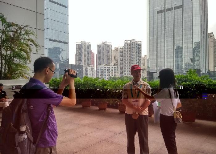 在前往深圳的列車途中以及參觀的同時,隊員們還通過問卷調查和采訪的形式,了解深圳本地居民和外來務工人員對改革開放、中國夢、深圳城市幸福感等方面的了解程度和評價。在深圳博物館,我們有幸采訪到一名78歲的志願者—陳勉,這位長者為人風趣,和藹可親,踐行“來了就是深圳人,來了就當志願者”的口号,4年如一日,堅持到館服務。他向我們分享了他做志願者的心得體會,他認為做志願者就是在踐行中國夢、踐行社會主義核心價值觀。