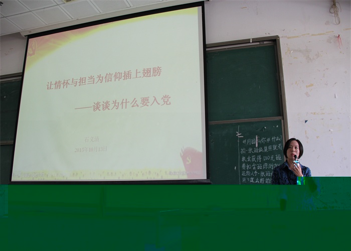 學院黨委委員、日語教工黨支部書記林青華老師在15級日語專業的黨課上以入黨動機為切入點,用優秀黨員的事迹告訴新生:入黨帶給我們的是無法用物質利益去衡量的成長,它潛移默化地影響着大家的學習工作生活;為了成長,我們不能功利地去計算入黨後能給自己帶來什麼具體的好處,并告誡同學們對入黨要樹立起正确嚴肅的态度。