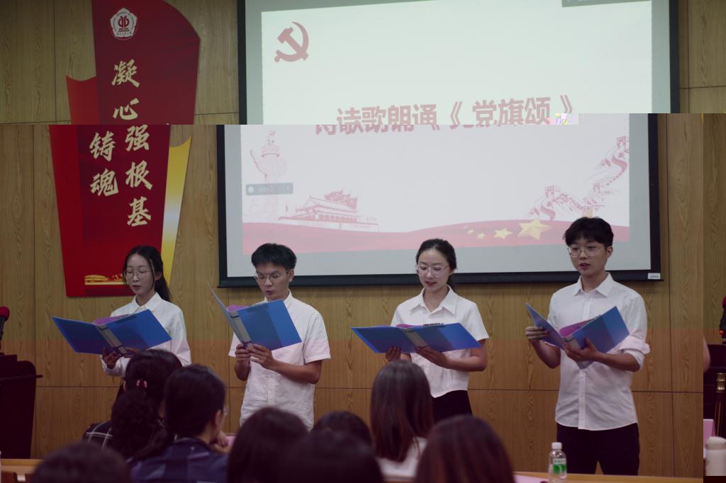 井岡山精神宣講團的同學為畢業生黨員們獻上朗誦節目《黨旗頌》,四位同學以飽滿的情感、激昂的語調,将黨旗的輝煌曆程和偉大意義娓娓道來,在場的每一位黨員都深刻感受到了黨旗下的神聖使命與光榮責任。