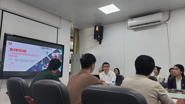 在主題講解環節,主講人劉璪、林沛雯和李慶駒(研究生)同學分别講述人類命運共同體理念、基本内涵與重大意義、人類命運共同體到人類衛生健康共同體理念的具體化表現。主講人結合當前疫情背景,通過講述中國和世界各國在構建衛生健康人類命運共同體采取的具體行動,中國體現的責任與擔當,疫情期間多個青年擔當優秀事例引發了黨員們對青年大學生在構建命運共同體中使命與擔當的思考與讨論。