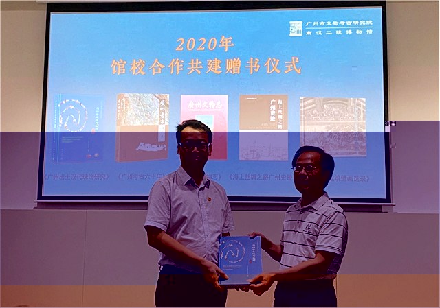 在南漢二陵館,廣州市文物考古研究院院長、南漢二陵博物館館長易西兵向與會嘉賓介紹了南漢二陵館的基本現況與文化遺存,歡迎合作共建單位深化交流,并向共建單位進行了授牌與贈書。校團委書記許澤浩、學院黨委副書記何婧雲接受共建授牌與贈書。