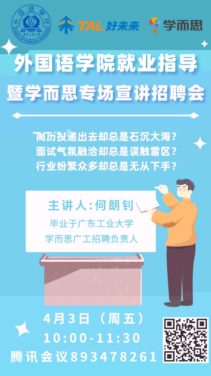 為有效應對疫情帶來的沖擊與影響,進一步促進學院畢業生就業工作順利開展,确保學院2020屆畢業生工作實現“穩中有進”和“提質增效”目标,我院于4月3日召開了2020屆畢業生就業指導暨網上專場招聘宣講會,會議邀請了學院就業實習協作單位——廣州學而思師資選培部何朗钊校友為畢業生進行就業指導及招聘宣講。