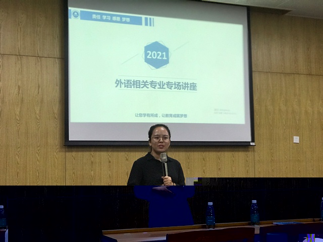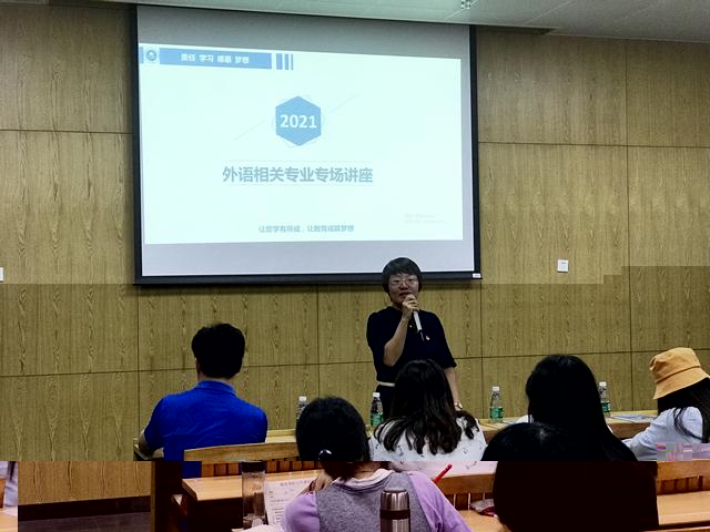 考研分析指導會上,明月老師分三部分内容向同學們進行分析指導。1.外語專業學生就業分析,就業、事業單位、出國留學和考研;2.考研院校和專業的選擇,強調要以目标學校對專業的不同要求做好明智的選擇;3.考研備考資料建議,以參考書目為基礎,筆記講義為參考,曆年真題為指導,著作論文為補充。明月老師語言風趣,條理清晰,詳細講解了外語專業考研備考的相關資訊,幫助同學們走出了對學碩和專碩的認識誤區,認真介紹了外語專業學生的考研方向等。