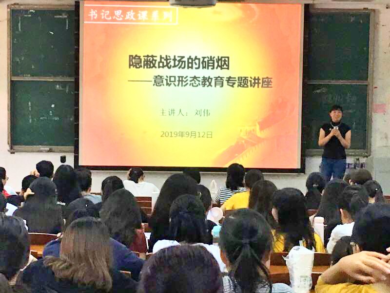 學院黨委書記劉偉在3号大課室給2018級英語大類專業本科學生講授了《隐蔽戰場的硝煙——意識形态教育專題講座》,她以習近平總書記在學習貫徹黨的十九大精神研讨班開班式上的講話為引題,回顧了中美關系的發展演變,向同學們解讀了美國對我國采取的意識形态鬥争政策的轉變,同時結合“蘇東劇變”、“顔色革命”等曆史事件向同學們介紹了美國對華“三步走”戰略和漸進式洗腦的意圖。接着,她結合最近香港的暴亂事件,說明雖然中國在不斷強大,但挑戰卻從未停止,西方敵對勢力與我國的意識形态鬥争一直在進行當中。她告誡同學們要“頂天立地”做人,居安思危,自覺維護國家意識形态安全。