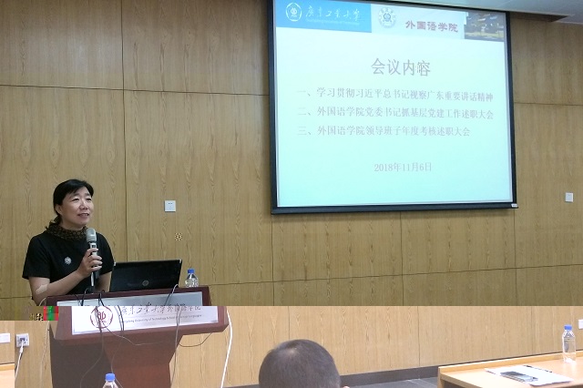 11月6日下午,我院召開全體教職工大會,會議集中學習習近平總書記廣東考察重要講話精神。并根據《關于做好2018年基層黨組織書記抓黨建述職評議考核工作的通知》和《關于做好2017-2018學年度考核工作的通知》要求,進行2018年二級黨組織書記抓黨建述職和2017-2018學年度考核領導班子成員述職。會議由黨委書記劉偉主持。