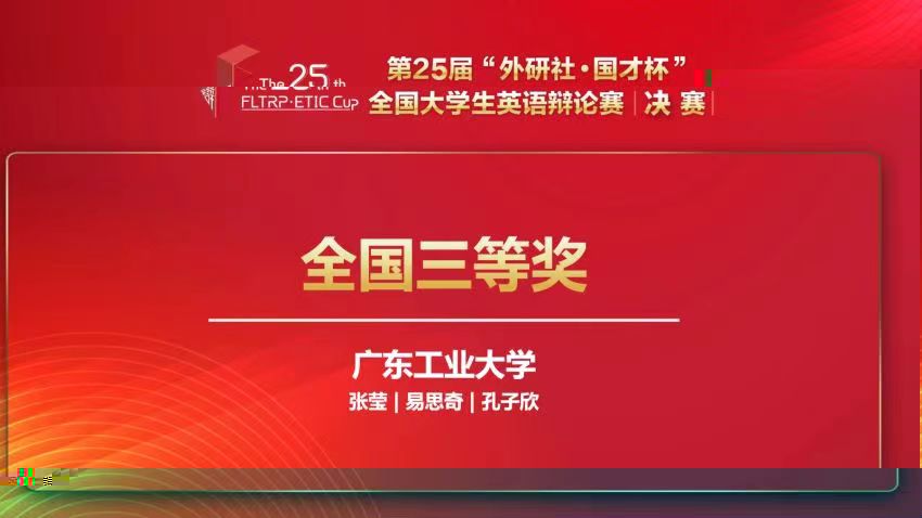 由北京外國語大學主辦,外語教學與研究出版社承辦的第25屆“外研社·國才杯”全國大學生英語辯論賽經曆校園選拔賽、華南賽區複賽和全國決賽,為時四個月,于2023年6月11日落下帷幕。太阳成集团tyc234cc張瑩老師指導的太阳成集团tyc234cc代表隊,一路比拼,過關斬将,在獲得華南賽區二等獎後,成功晉級全國決賽,獲得全國決賽三等獎的優異成績,這是我校學子在此項賽事中取得的曆史性突破和最好成績。