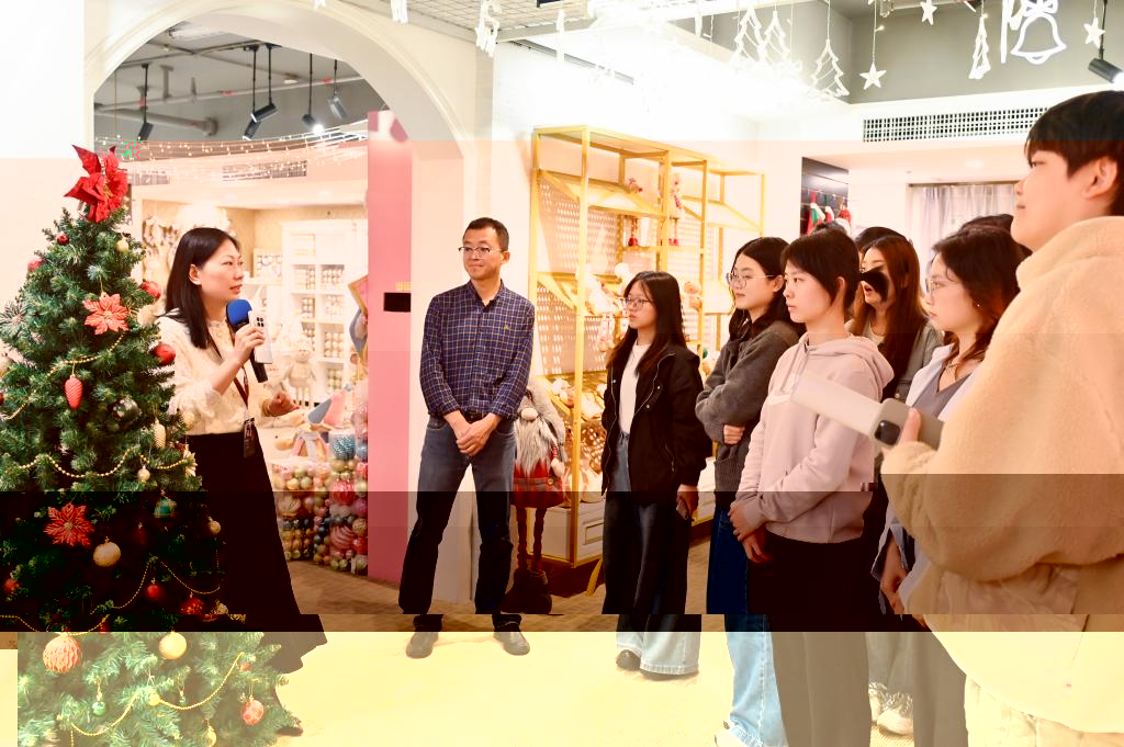 活動伊始,陳海恒帶領學院師生參觀了公司産品展廳與文化長廊,詳細介紹了盈浩文創集團的發展曆程及核心業務。作為全球工藝美術品整體供應商,盈浩集團主營節日裝飾品、家居工藝品及創意裝飾畫三大類産品,市場覆蓋80多個國家和地區,是國家文化出口重點企業及高新技術企業。通過現場觀摩與講解,師生們對企業的創新研發實力、全球化運營模式及文化貿易全流程有了直觀認識。